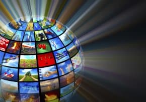 Previous Image Next Image Media technologies concept Creative media technologies concept: glowing sphere with images on black background